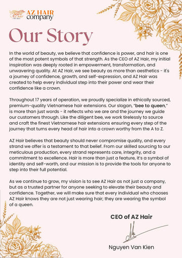 From 2023 onward, AZ Hair continues its mission to lead the Vietnamese hair industry with innovation, transparency, and sustainability. We expand our presence across Alibaba, and global e-commerce platforms, integrating AI-driven customer care and modern production technology. With each milestone, AZ Hair proudly represents the elegance and excellence of Vietnamese craftsmanship to the world.