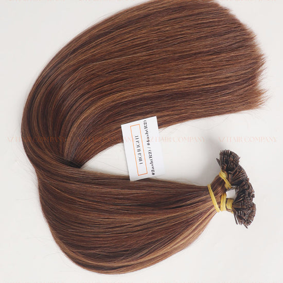 Flat Tip Hair Extensions in Color Highlight (#2ash/4ash) – A luxurious cool ash highlight effect that looks natural, sophisticated, and ultra-trendy, giving the impression of professionally dyed hair. The hair is colored in a true ash tone that is long-lasting and resistant to yellowing over time. Made from premium Vietnamese Remy hair with secure, comfortable, and durable Flat Tip Keratin bonds, these extensions are the perfect choice for clients who want a fashionable, on-trend hairstyle while maintaining a completely natural look.