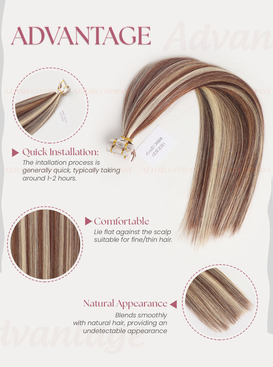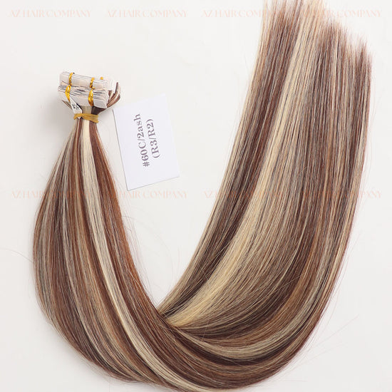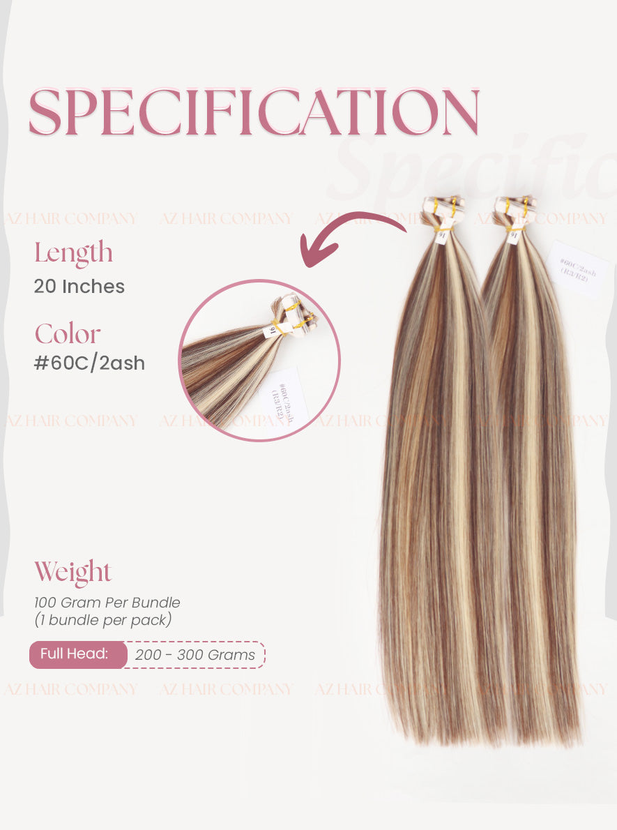 The Regular Tape In Hair Extensions in Color Highlight #2ash/#60C feature a beautiful contrast between deep ash brown and cool platinum blonde, creating a brighter yet perfectly balanced look. The tones are intricately blended strand by strand, as shown in the image, producing a refined, dimensional, and luxurious highlight effect. Made from 100% Vietnamese Remy human hair with intact cuticles, the strands are smooth, naturally straight, soft, and free from tangling or frizz. The extensions are easy to install and remove, saving time for clients and stylists, and are suitable even for fine hair or those who need added volume naturally.