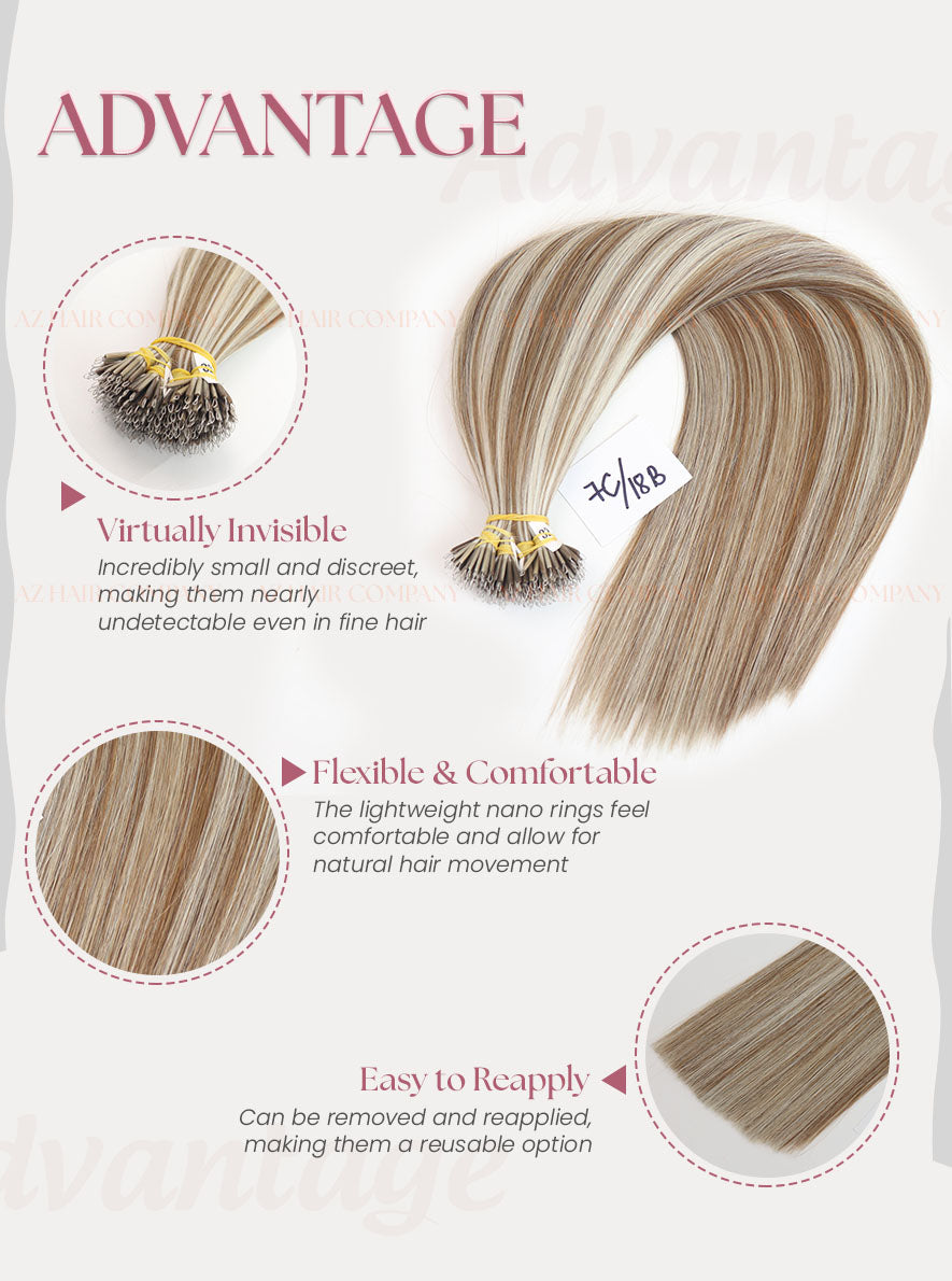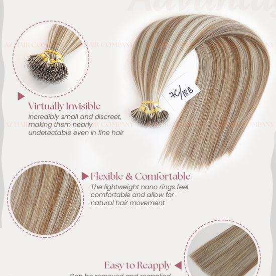 Celebrate natural beauty with Highlight #7C/18B - Nano Tip Hair Extensions – a harmonious blend of neutral smoky brown (#7C) and light beige blonde (#18B). The soft color transition creates a gentle, elegant, and incredibly natural highlight effect, adding depth and refined brightness to the hair. The ultra-small Nano Tips provide a seamless, nearly invisible attachment, ensuring a secure hold without adding weight—perfect even for fine or delicate hair. With high durability and consistent quality in every order, we also offer custom production based on your preferred colors and bulk quantities.
