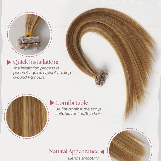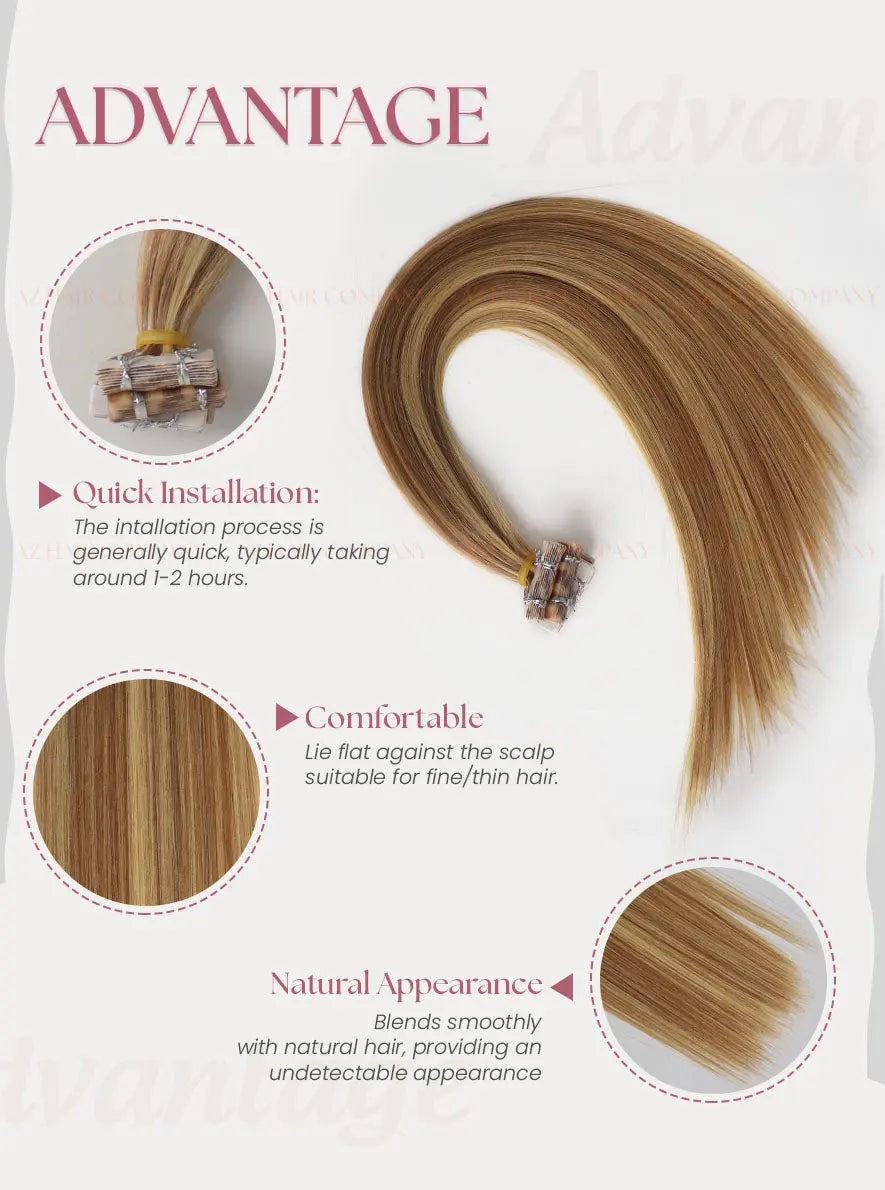 Tape-in hair extensions are a popular choice for those looking to enhance their natural hair with added length and volume. These extensions feature a strong, double-sided tape that securely adheres to your hair, creating a seamless, natural-looking blend. They are easy to apply, comfortable to wear, and can be removed with minimal hassle, making them an ideal option for both temporary and long-term use.